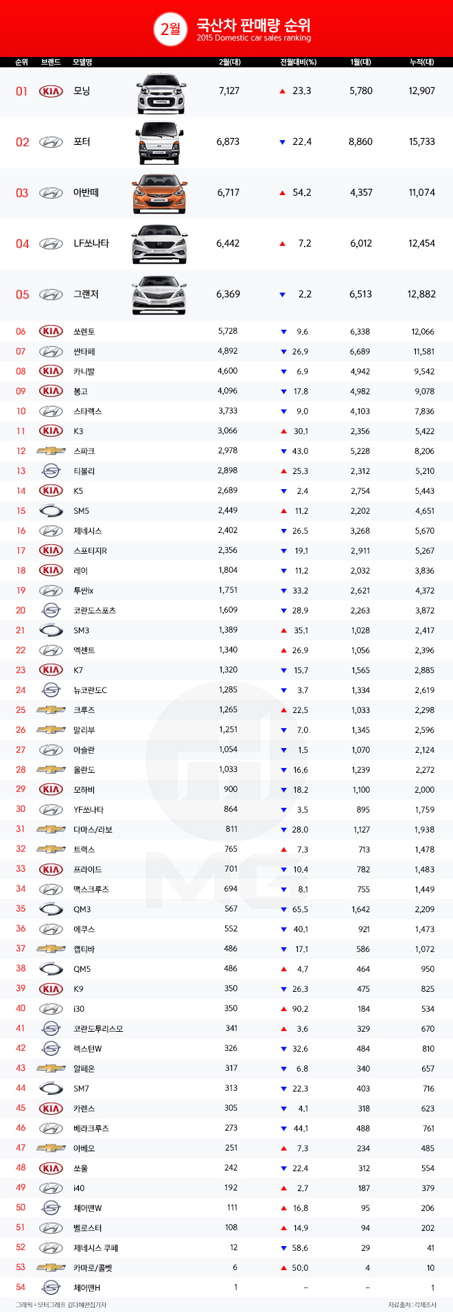 이밖에 기아차 K5(2689대), 르노삼성 SM5(2449대), 현대차 제네시스(2402대), 기아차 스포티지R(2356대), 기아차 레이(1804대), 현대차 투싼ix(1751대), 쌍용차 코란도스포츠(1609대) 등이 20위권을 형성했다.