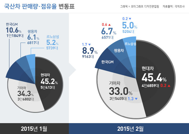 쌍용차는 전월(6817대) 대비 3.6% 감소한 6571대를 팔았지만, 티볼리 출시 이후 2달 연속 르노삼성을 앞섰다. 점유율은 6.1%에서 6.7%로 올랐다.
