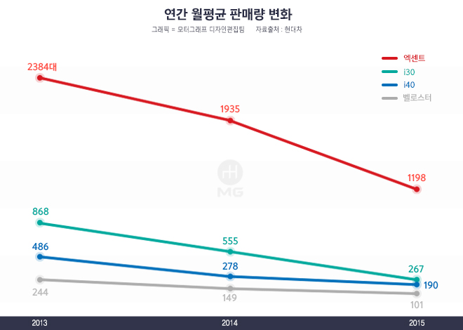 업계 한 전문가는 ”변속기만 바꿨다고 갑자기 판매량이 늘어날리 없지 않겠냐"면서 “상품성 개선 효과를 소비자가 알기 어려워, 보다 종합적이고 근본적인 대책이 필요하다"고 말했다. 실제로 엑센트의 월평균 판매량은 2013년 2384대에서 작년 1935대로, 벨로스터는 244대에서 149대로, i30은 868대에서 555대로, i40은 486대에서 278대로 모두 크게 감소했다.