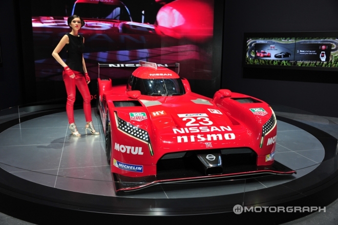 ▲ 닛산은 아주 희귀한 레이스카를 선보였다. 닛산은 이 차를 들고 르망 24시간 내구레이스에 나선다. GT-R LM 니스모의 이번 성적에 따라 레이스카의 판도가 바뀔지도 모른다. 이차는 독특하게 본격적인 레이스카로는 드물게 차체 앞쪽에 엔진을 탑재했고, 전륜구동이다. 앞바퀴가 구동과 방향전환을 모두 책임지기엔 부담이 많다는게 현재의 판도다. 하지만 닛산은 과감하게 발상을 전환했다. 오히려 프론트 엔진과 프론트 드라이브가 접지력에 있어서 더 우수하다는 판단이다. 그래서 앞바퀴 타이어의 면적은 356mm, 뒷바퀴 타이어의 면적은 229mm로 독특한 구성을 지니게 됐다.