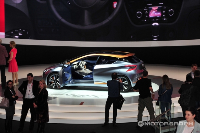 ▲ 스웨이 콘셉트는 닛산의 차세대 B세그먼트 소형차다. 폭스바겐 폴로, 푸조 208 등과 경쟁하게 된다. 양산 모델은 내년 공개될 예정이다. 캐시카이, 펄사, IDx 콘셉트 등의 디자인 요소가 적용됐다. 닛산은 동급 최고 수준의 실내 공간 확보에 주력할 계획이다.