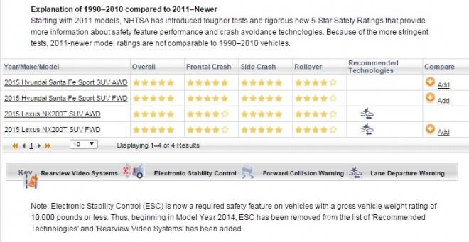 NHTSA의 신차 안전도 평가는 정면 충돌(front crash), 측면 충돌(side crash), 전복(rollover) 등 세 가지 분야로 구성돼 충돌에 따른 차량 내구성과 안전성 등에 관한 정보를 제공한다. 별 5개를 만점으로 별의 개수가 많을수록 안전한 차다.
