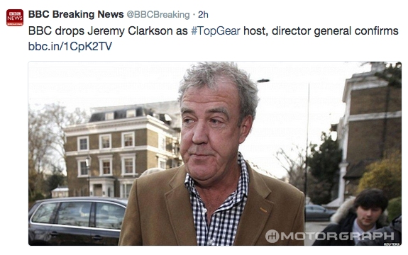 세계 3억5천만명이 시청하는 최대 자동차 쇼 톱기어의 간판스타 제레미클락슨(Jeremy Clarkson)이 영국 BBC에서 해고 됐다. 동시에 자신이 키웠던 '톱기어(TopGear)'에서도 퇴출되고 말았다. 알기쉽게 말하자면 무한도전에서 유재석이 퇴출된 격이다. 그래서 이 소식은 영국, 미국을 비롯한 세계 각국 언론이 속보로 다루고 있다.