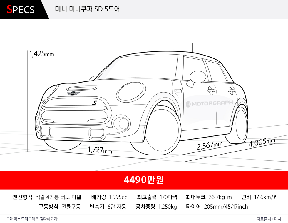 기존 3도어와 동일한 레이아웃을 유지하면서도 휠베이스를 살짝 늘렸다. 허리가 길어지면 자칫 미니 특유의 귀여움이나 발랄함을 잃을 수도 있는 상황. 5도어라고 무조건 차체를 늘릴 수도 없는 노릇이다. 특히 미니의 낮은 차체와 각진 루프는 3도어에 특화된 디자인이다.