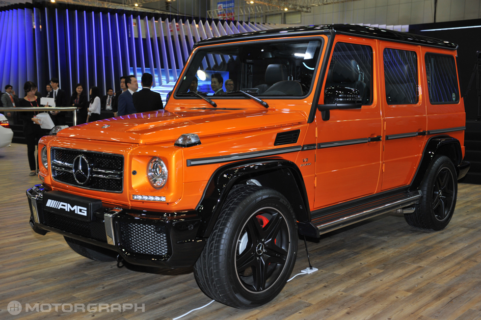 ▲ 다양한 AMG 모델이 공개됐고, 시선을 끄는 꽃담황토색의 G63 AMG도 공개됐다. G클래스는 언제나 인기 만점이다. 가장 메르세데스-벤츠 답지 않은 차지만 브랜드의 이미지까지 이끌고 있다. 또 '드림카'라는 측면에서 소비자들의 욕구를 자극하는 모델이다.