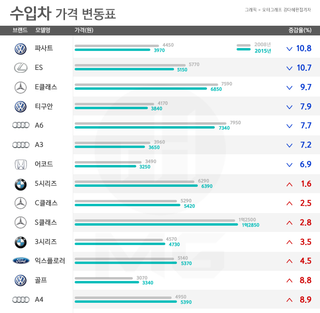 폭스바겐은 파사트를 2008년 4450만원에서 올해 3970만원으로 10.8%, 티구안은 4170만원에서 3840만원으로 내렸다. 렉서스도 ES의 가격을 5770만원에서 5150만원으로 10.7% 인하했으며, 메르세데스-벤츠도 E클래스를 7590만원에서 9.7% 내린 6850만원에 판매했다.