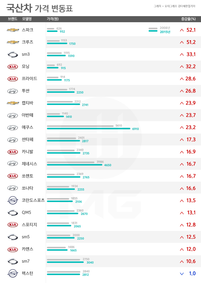 가장 많이 오른 모델은 쉐보레 스파크와 크루즈로, 7년 동안 무려 50% 이상 비싸졌다. 본래 낮은 가격을 고수하던 한국GM이 2011년 쉐보레 브랜드를 도입하면서 가격을 크게 올렸기 때문이다. 스파크의 경우 2008년 마티즈일 때는 626만원에 기본 모델을 살 수 있었지만, 올해에는 52.1%이 오른 952만원을 줘야 한다. 크루즈도 라세티란 이름으로 1153만원부터 팔았지만, 지금은 51.2% 올려 1750만원을 내야 한다.