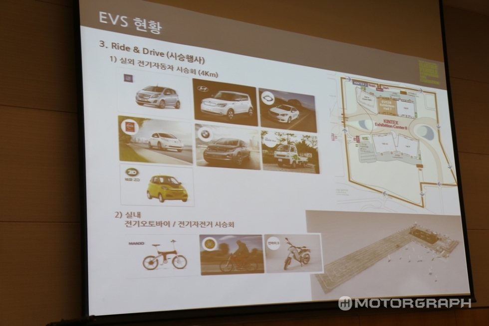 특히, GM은 스파크EV, 현대차는 쏘울EV, 르노삼성은 SM3 Z.E., 닛산 리프 등 완성차 업체들의 전기차가 전시되며, 만도 풋루스, 이탈로 오토사이클스(ITALO OTOCYCLES) 등은 전기자전거를 선보인다. 또, CM파트너는 전기오토바이를 공개할 예정이다.