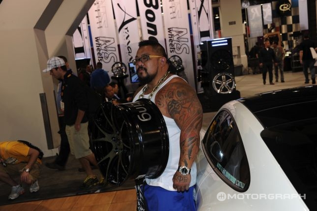 세마쇼에 참가한 한 휠 업체는 탄소섬유 강화플라스틱으로 제작한 휠을 독특한 방법으로 홍보했다. 근육질의 남자 모델이 휠을 마치 목걸이처럼 목에 매달았다. 업체는 휠의 가벼움을 알리기 위해 이같은 방법을 택했다고 밝혔다.