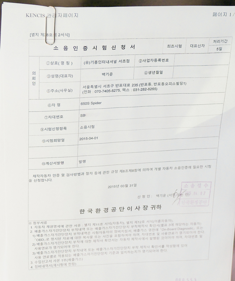 이 차들은 기흥인터내셔널의 소유로 최초 소음 시험 및 인증을 받기 위해 대기중이었다. 이는 대표신차를 시험하는 것으로 1대를 인증 받으면 10대(병행수입) 혹은 수백대(환경협회 가입시)를 시험 없이 통과할 수 있게 된다. 기흥인터내셔널 서초점의 대표 백기운씨가 직접 서류에 사인 했다.