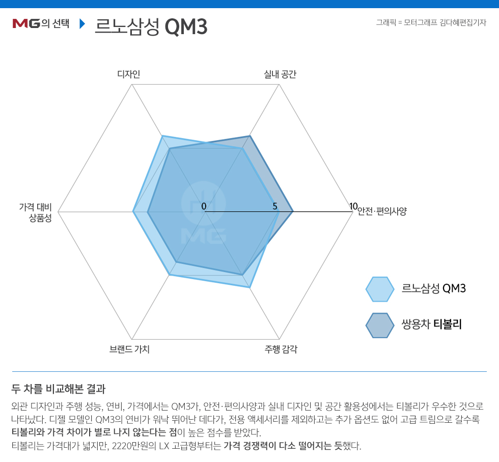 다양한 트림과 가격대를 갖춘 티볼리가 선택의 폭이 넓었지만, QM3가 150~200만원가량 비싼 디젤 모델인 것과 추가 옵션으로 인한 가격 상승, 연비 차이까지 고려하면 QM3의 상품성이 조금 더 뛰어난 것으로 분석된다.