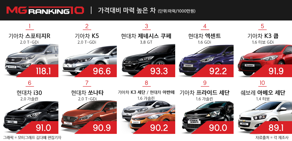 모터그래프는 400여 종의 국내 판매되는 자동차 중 가격대비 최고출력이 가장 높은 차를 조사했다. 다른건 다 뒤로 하고 오로지 어떤 차가 가장 '출력 효율적'인지 살폈다.