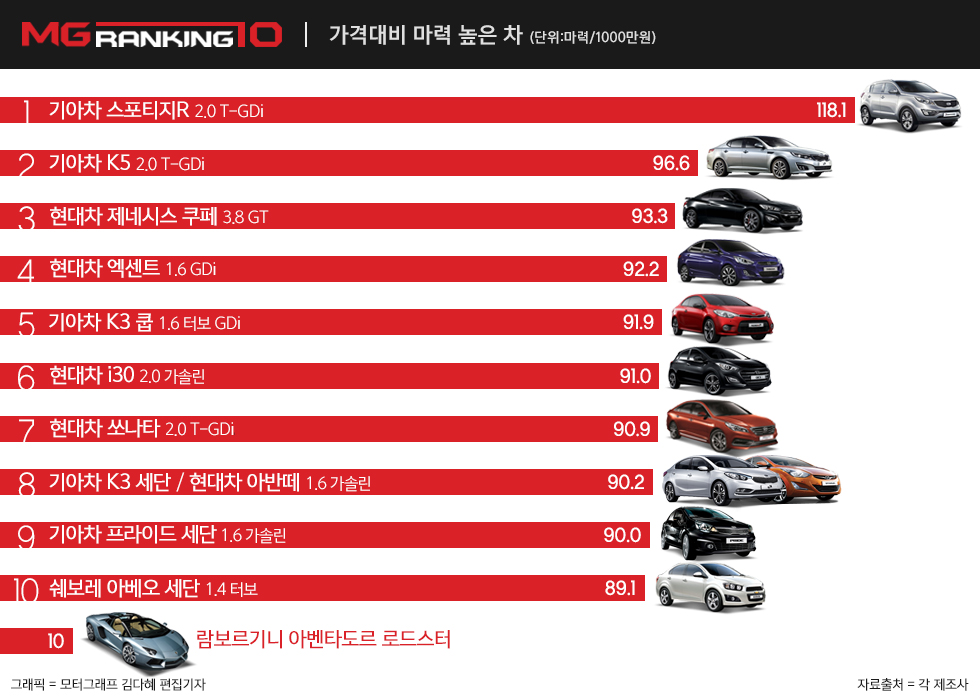 아래는 현재 국내 판매 중인 차종 중 가격대비 마력이 우수한 모델 10대다. 단 자동변속기 장착 모델 기준이다.