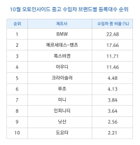 수입 중고차 브랜드별 등록대수는 BMW가 1위를 차지했으며, 메르세데스-벤츠와 폭스바겐이 뒤를 이었다. 4위는 아우디, 5위는 크라이슬러가 이름을 올렸으며, 다음으로는 푸조, 미니, 인피니티, 닛산, 도요타 순으로 나타났다.