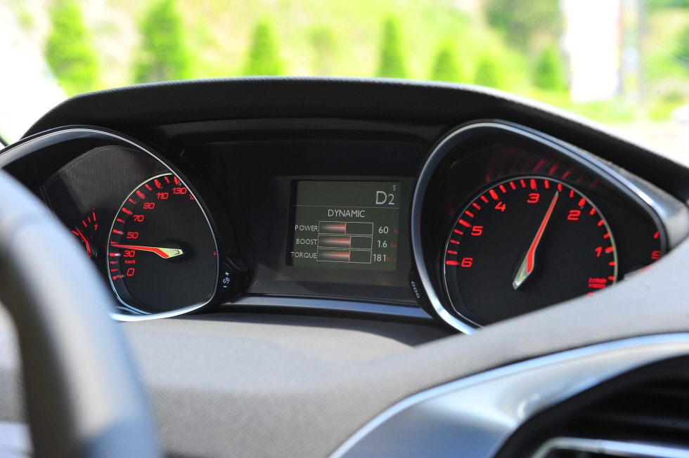 신형 308에 탑재된 1.6리터급 블루HDi 엔진은 최고출력 120마력, 최대토크 30.6kg·m로, 이전(112마력, 27.5kg·m)보다 동력 성능이 꽤 좋아졌다. 제원상으로는 골프 1.6(105마력, 25.5kg·m)과 비교해도 10% 이상 우수한 수치다. 특히, 비슷한 회전수에서 토크가 크게 향상돼 초반 가속력이 더 뛰어나며, 중고속 영역까지 빠르게 속도를 냈다. 또, 공회전 및 주행 소음을 효과적으로 줄이고, 디젤 엔진 특유의 진동도 잘 잡아냈다. 정상적인 드라이브(D) 모드에서 는 진동과 소음으로 스트레스받을 일이 없다. 전체적으로 완성도가 높은 엔진이다.