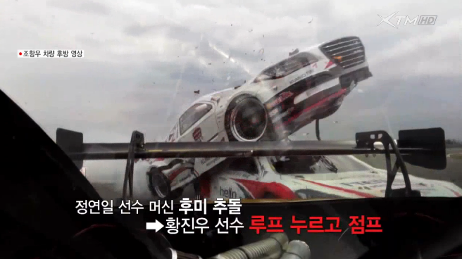 당초 브레이킹의 문제로 앞차를 밟고 치솟아 공중 회전하는 대형 사고였다는 것은 알려졌지만 이번 프로그램에선 당시 실내의 긴박한 상황이 공개돼 MC들을 아연하게 만들었다. 실내 영상에서는 차가 부딪칠때마다 차의 외장이 하나씩 깨져 나가면서 운전자가 외부로 그대로 노출됐고 롤케이지(전복시 운전자의 안전을 돕는 구조물)까지 일부 손상될 정도의 큰 충격이었다.