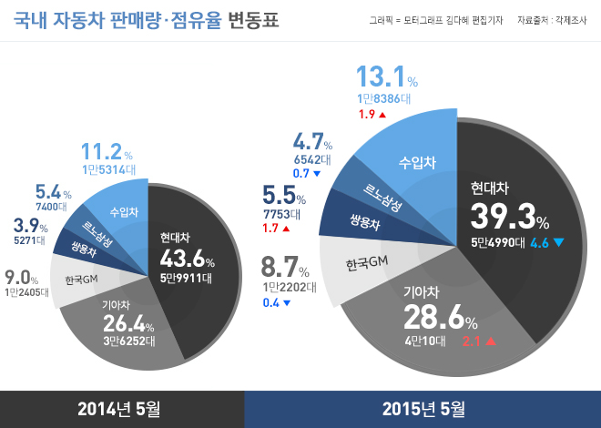 지난달 국내 자동차 시장 점유율은 현대차가 39.3%로 전년 대비 4.6%p 감소했으며, 기아차는 28.6%로 2.1%p 늘었다. 한국GM은 0.4%p 줄어든 8.7%를 기록했으며, 쌍용차는 5.5%로 1.7% 늘고 르노삼성은 4.7%로 0.7%p 줄었다. 수입차는 11.2%에서 13.1%로 1.9%p 올랐다.