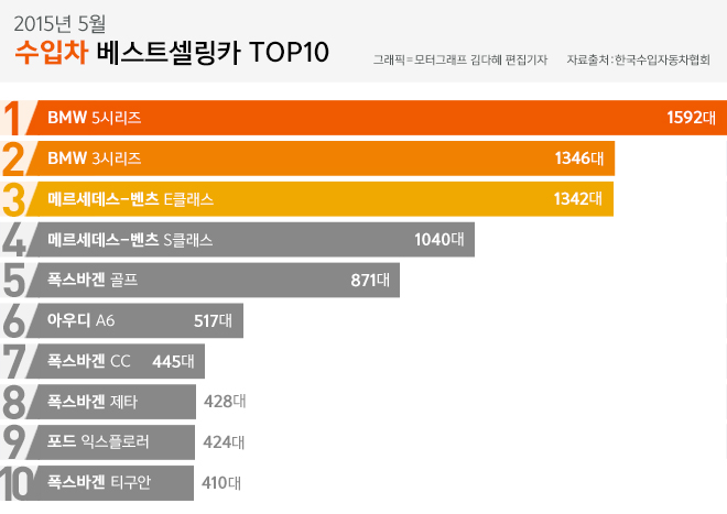 모델 체인지로 공백이 있었던 A6는 지난달 출시된 페이스리프트 모델이 517대 팔려 10위권에 복귀했으며, 폭스바겐의 CC와 제타, 티구안 3총사도 각각 445대, 428대, 410대 판매돼 상위권에 랭크됐다.