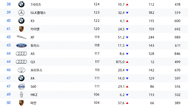 다음으로는 포드·링컨(941대)과 미니(667대), 렉서스(571대), 도요타(560대), 닛산(496대), 크라이슬러·지프(494대)가 10위 권에 이름을 올렸다. 이밖에, 푸조 462대, 포르쉐 370대, 혼다 362대, 랜드로버 355대, 볼보 306대, 인피니티 236대, 재규어 149대, 캐딜락 65대, 시트로엥 58대, 피아트 46대, 벤틀리 34대, 롤스로이스 5대 순이다.