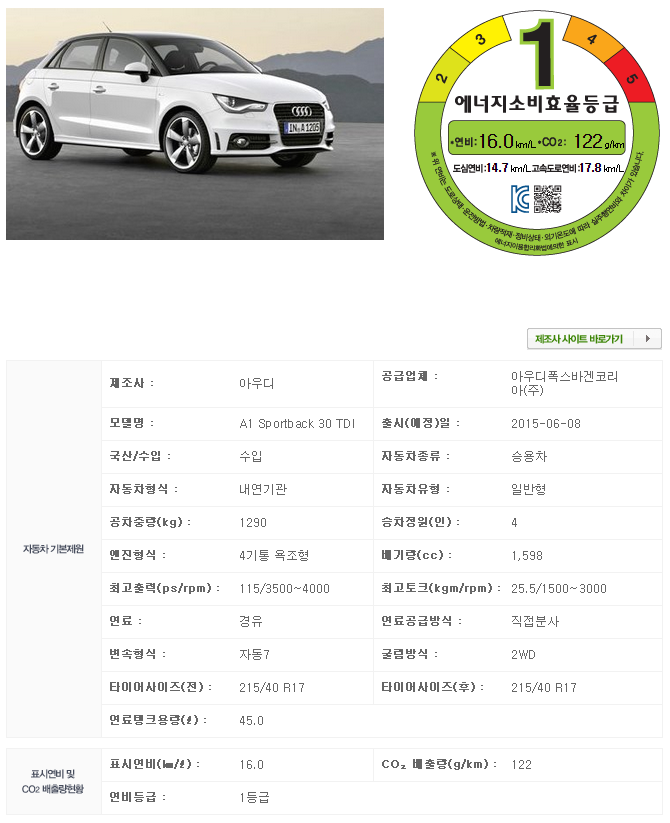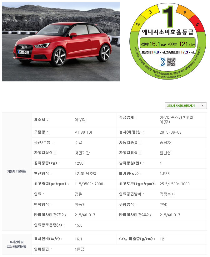 9일, 에너지관리공단 수송에너지 홈페이지를 통해 아우디 A1의 연비가 공개됐다. A1 5도어 스포트백은 복합연비 16km/l(도심 14.7km/l, 고속도로 17.8km/l), 3도어는 복합연비 16.1km/l(도심 14.8km/l, 고속도로 17.9km/l)를 기록했다.