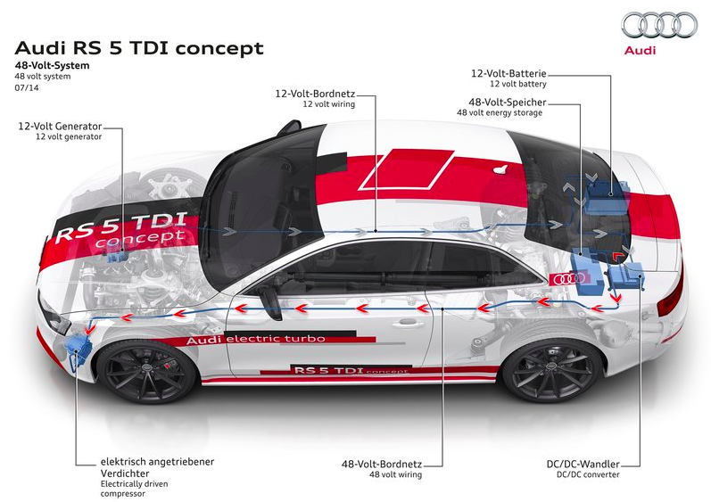 아우디 RS5 TDI 콘셉트에는 3.0리터 V6 TDI 바이-터보 엔진이 탑재됐다. 터보 차저와 함께 전동식 컴프레셔(Electrically Driven Compressor)가 추가됐다. 아우디는 이를 ‘일렉트릭 터보’라 부른다. 전동식 컴프레셔를 돌리는 7kW의 전기모터가 적용된 점이 특징이다. 아우디는 이 시스템을 통해 전 구간에서 일관적인 반응을 끌어내는데 주력했다.