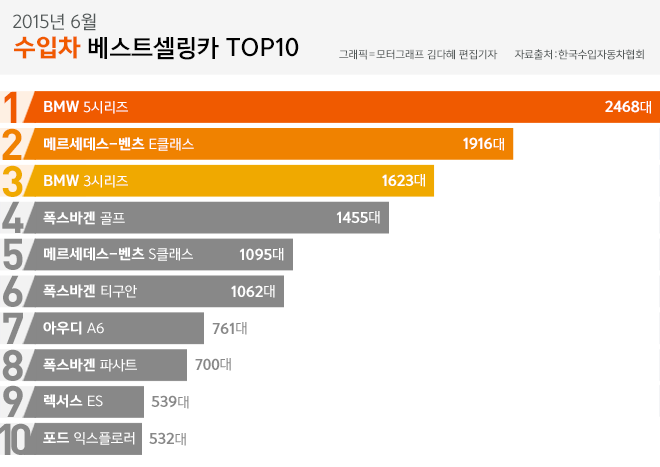 1~6월 상반기 누적 판매량은 BMW 2만4206대, 메르세데스-벤츠 2만2923대, 폭스바겐 1만8635대, 아우디 1만4559대, 포드·링컨 5625대, 도요타 3777대, 미니 3653대, 렉서스 3651대, 재규어·랜드로버 3267대, 크라이슬러·지프·피아트 3178대, 푸조 2978대 순이다.