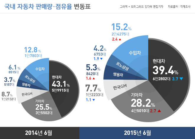 지난달 시장 점유율은 현대차가 39.4%로 전년 대비 3.7%p 감소했으며, 기아차는 28.2%로 2.7%p 늘었다. 현대차와 기아차를 더한 점유율은 67.6%로, 기아차의 실적이 살아나지 않았다면 65% 밑으로 떨어질 수도 있는 상황이었다. 한국GM은 전년과 비슷한 판매량을 기록했지만, 점유율은 1.0%p 줄어들어 7.7%에 머물렀다. 쌍용차는 티볼리의 활약으로 1.6% 늘어난 5.3%, 르노삼성은 4.2%로 1.9%p 줄었다. 수입차는 12.8%에서 2.4%p 오른 15.2%로, 처음 15%를 넘겼다.