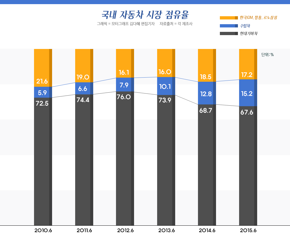 현대기아차의 내수 점유율이 3년 만에 무려 8.4%나 폭락했다. 급증한 수입차를 제대로 방어하지 못한 데다가, 최근 인기를 모으고 있는 초소형 SUV 세그먼트에 대한 대책이 없어 쌍용차와 르노삼성에 점유율을 상당 부분 빼앗긴 것으로 분석된다. 같은 기간 수입차 점유율은 15.2%로 7.3%p 늘었으며, 쌍용차(5.3%)와 르노삼성(4.2%)은 각각 2.3%p, 1.2%p 증가했다.
