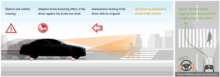 메르세데스-벤츠는 전방 카메라와 센서 등과 연동된 다양한 안전 및 편의장비를 개발하고 있다. 현재 보행자나 장애물이 감지되면 스스로 멈추거나, 차선이탈을 막기 위해 스스로 스티어링휠을 돌려 방향을 전환하기도 한다. 메르세데스-벤츠는 이러한 편의 및 안전 장비를 더욱 발전시키고 있다.