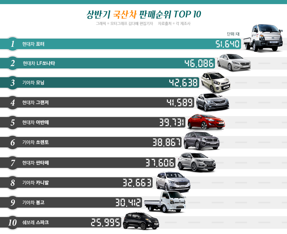아래는 상반기 가장 많이 판매된 국산차 10종.