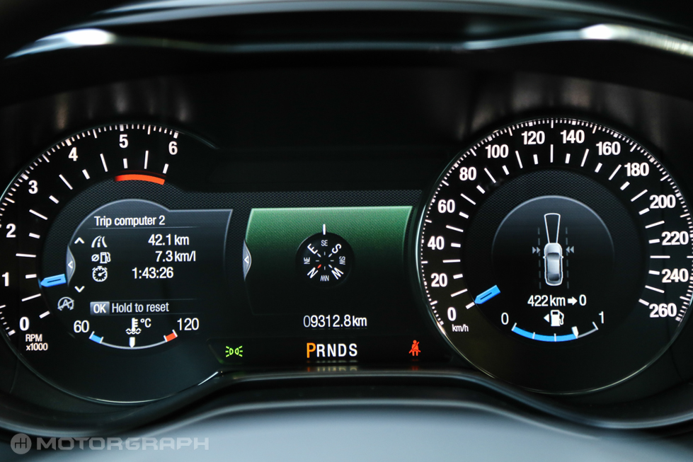 계기반은 무척 다양한 정보를 제공한다. 글씨체나 아이콘 등의 디자인 완성도도 높다. 단순히 포드가 미국 브랜드라서 투박할꺼라 생각하면 오산이다. 요소 하나하나가 매우 섬세해서 각종 정보가 한눈에 들어온다. 주로 손이 닿는 부분은 가죽 소재를 사용해 고급감을 높였다.
