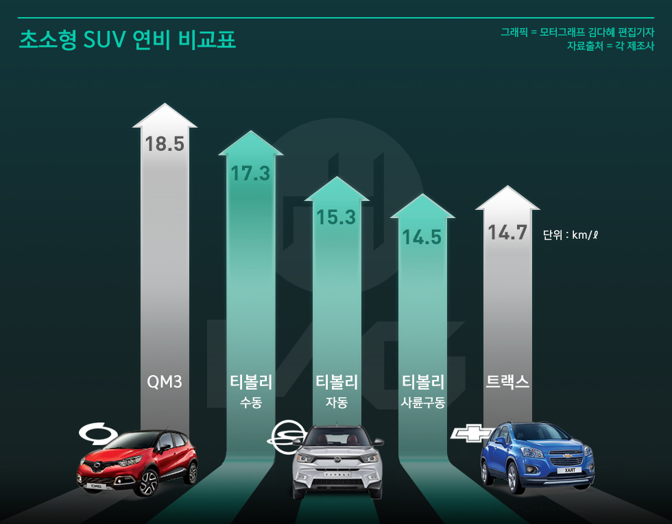 그러나 동급 경쟁 모델보다는 다소 떨어진다. QM3(18.5km/l)보다는 21%, 티볼리 디젤(15.3km/l)보다는 4% 부족한 수준이다.