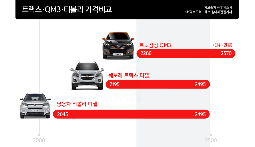 가격은 티볼리 디젤과 QM3 사이다. QM3의 경우 4개의 트림으로 판매되며, 가격은 SE 2280만원, LE 2380만원, RE 2495만원, RE 시그니처 2570만원이다. 티볼리 디젤은 3개 트림으로 판매되며, 가격은 TX 2045만원, VX 2285만원, LX 2495만원이다.