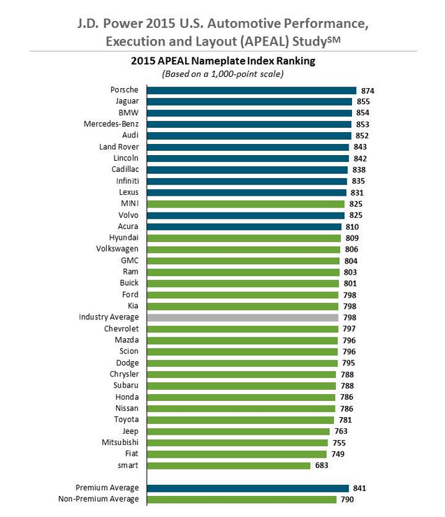 올해 조사에서 포르쉐는 전년(882점) 대비 8점 하락한 874점을 받았지만, 가장 높은 점수로 11년 연속 1위를 차지했다. 다음으로는 재규어(855점), BMW(854점), 메르세데스-벤츠(853점), 아우디(852점), 랜드로버(843점), 링컨(842점), 캐딜락(838점), 인피니티(835점), 렉서스(831점) 등 프리미엄 브랜드가 상위권을 독차지했다.