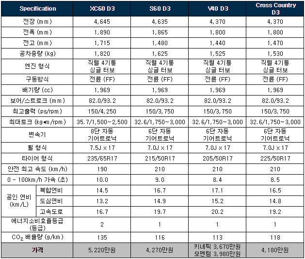 볼보 D3 모델의 가격은 XC90 5220만원, S60 4270만원, V40 3670~3980만원, 크로스컨트리 4180만원이다.