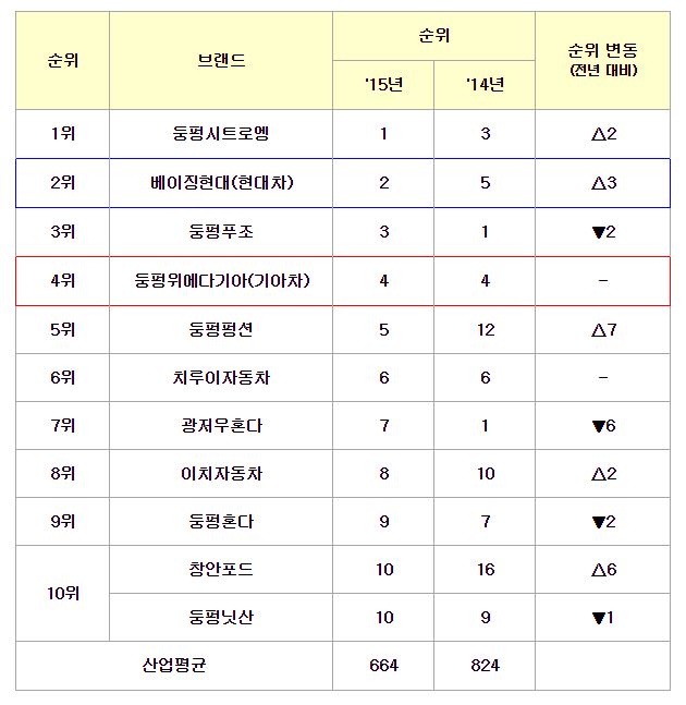 현대차는 1000점 만점에 794점을 기록, 1위 둥펑시트로엥(804점)에 이어 2위를 차지했다. 작년에 비해 3단계나 오른 기록이다. 기아차는 776점으로 작년과 동일한 4위에 올랐다.