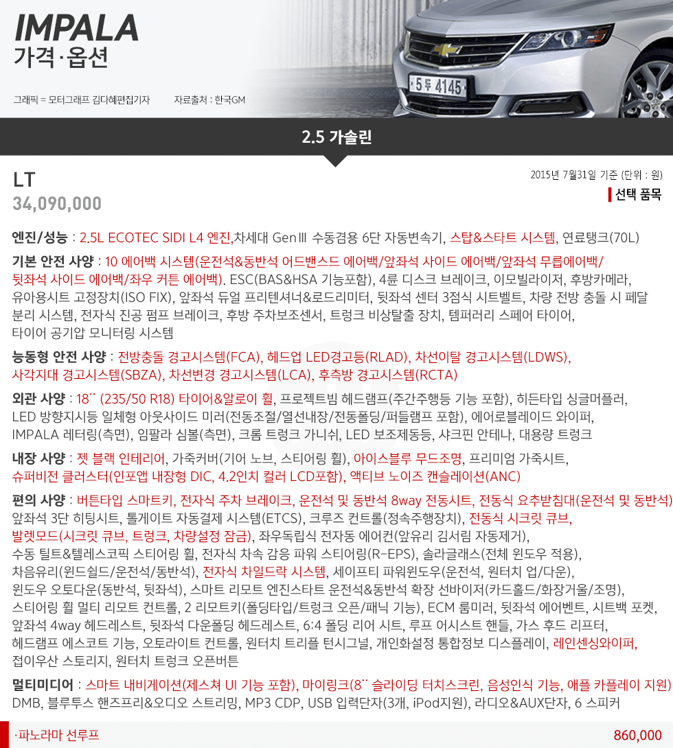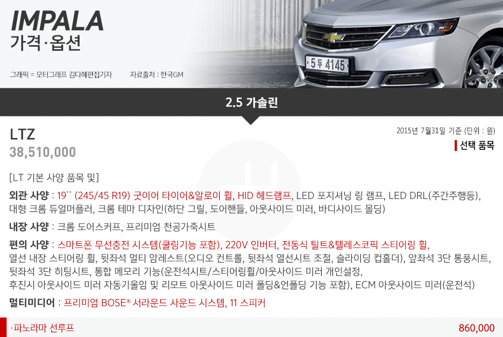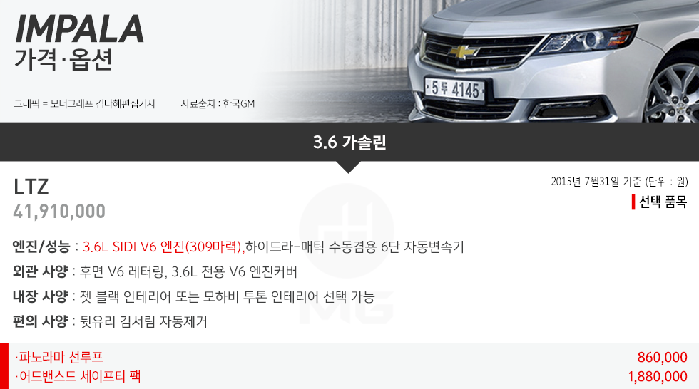 모터그래프는 4일, 한국GM이 전국 각 대리점에 공개한 쉐보레 임팔라의 옵션·가격표를 정리했다. 임팔라는 국내 생산이 아닌 미국에서 수입·판매되는 모델로, 소비자가 선택할 수 있는 선택 옵션의 종류는 적은 편이다. 중간급에서부터 대부분 기능이 기본 장착돼 있기도 하다.