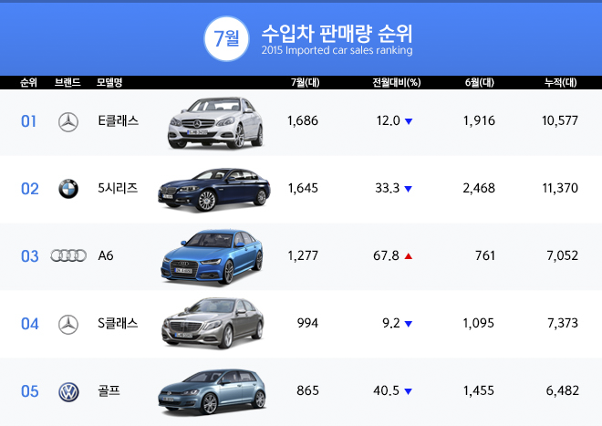 올해 1~7월 누적판매량은 BMW 5시리즈가 1만1370대로 1위, 메르세데스-벤츠 E클래스가 1만577대로 2위, 메르세데스-벤츠 S클래스가 7373대로 3위, 아우디 A6가 7052대로 4위, 폭스바겐 골프가 6482대로 5위를 차지했다.