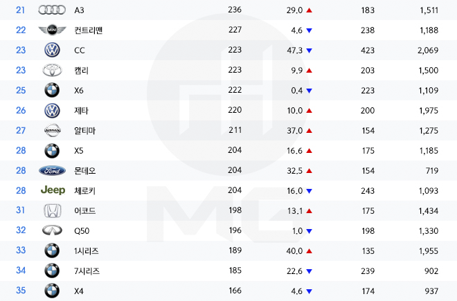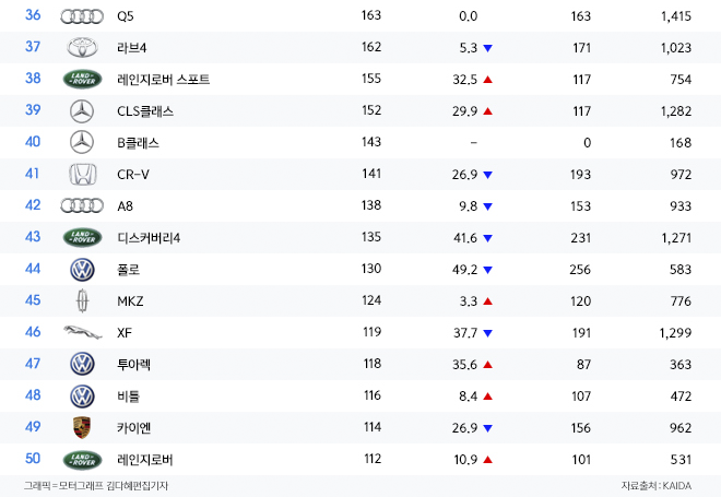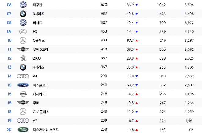 폭스바겐 티구안은 670대로 6위, BMW 3시리즈는 637대로 7위다. 다음으로는 폭스바겐 파사트(627대), 렉서스 ES(463대), 메르세데스-벤츠 C클래스(433대)가 10위권에 이름을 올렸다.