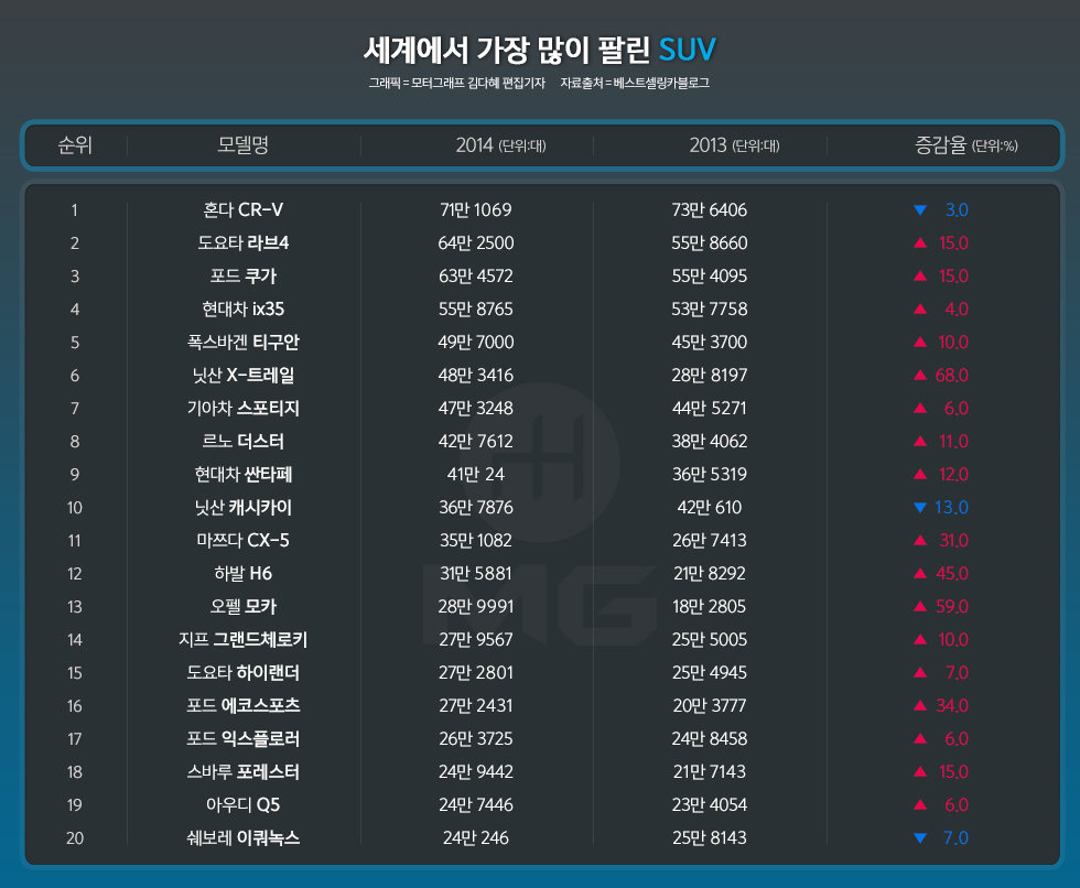 현대차 투싼은 전년(53만7758대) 대비 4% 성장한 55만8765대 판매돼 폭스바겐 티구안을 제치고 4위에 올랐다. 중국에서는 17만1411대로 8% 줄었지만, 유럽(7만3507대)과 미국(4만6306대)은 각각 5%, 7% 증가했다. 5위인 티구안과의 격차는 2013년 8만4058대에서 작년 6만1765대로 줄었다.