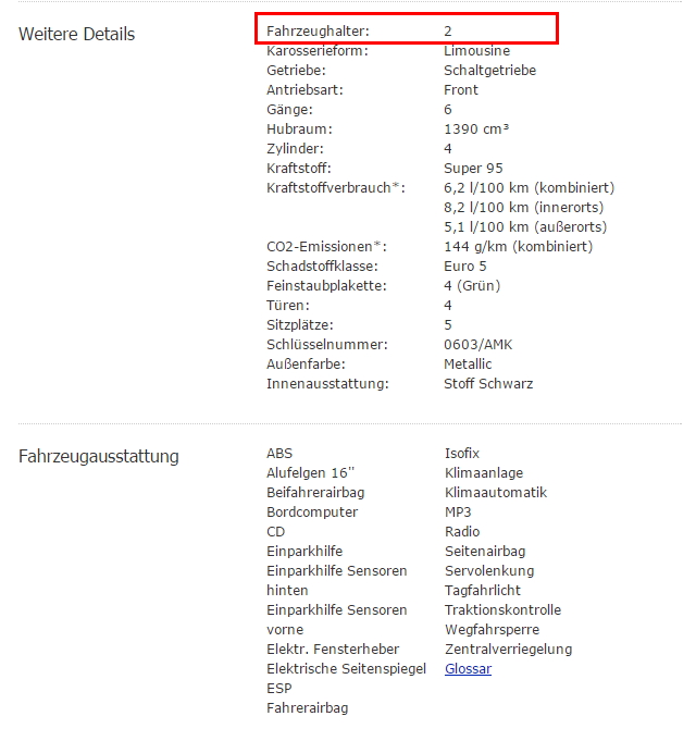 중고차의 연식이 오래되었거나 주행거리가 많을수록 매물의 소유자가 여럿 바뀌었을 가능성이 높다. 한 사람이 오래 타는 것과 주인이 자주 바뀌며 타는 것은 차의 관리 측면에서도 차이가 있을 수밖에 없다. 따라서 해당 매물이 몇 번이나 새로운 주인을 맞았었는지를 거의 모든 딜러들은 밝히고 있다. 만약 이를 밝히지 않은 경우 거래는 잘 이뤄지지 않는다. 우리나라에서도 일부 딜러들이 인터넷 사이트에 이를 올리고는 있지만 독일처럼 일반적이지는 않다.