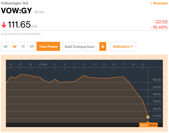 폭스바겐그룹 주가가 연일 폭락을 거듭하고 있다. 주식 가치는 2011년 이전으로 돌아갔을 정도로 끝없이 떨어지고 있다. 앞으로 예상되는 수많은 소송, 그리고 그에 따른 배상금액은 상상하기 어려운 수준이다.