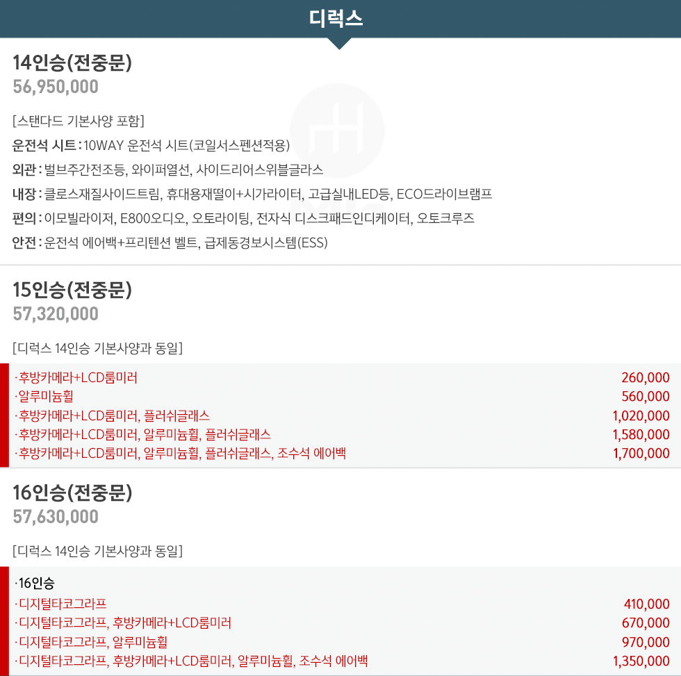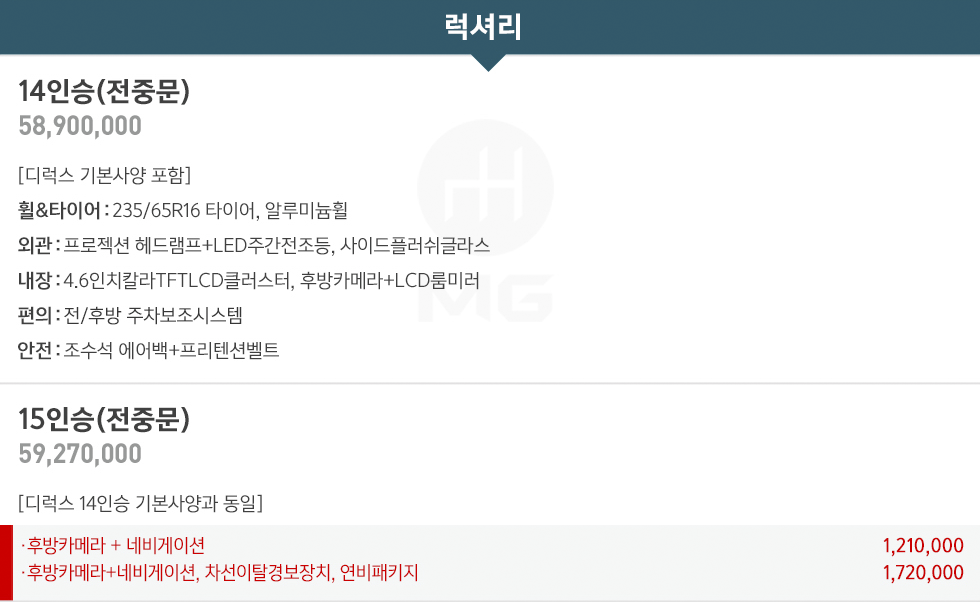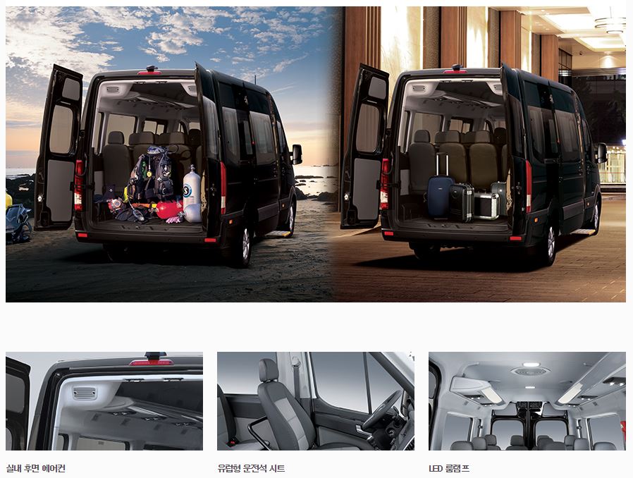 가격은 5582만원부터 시작하며 모든 옵션을 더한 최고사양 모델은 6099만원까지 올라간다. 최저트림인 스탠다드 모델은 16인치 스틸휠을 비롯해, 승객 탑승용 중문이 열리면 자동으로 작동되는 전동스탭, 승객좌석 선반, 2.6인치 LCD클러스터, 열선 전동식 아웃 사이드 미러, 후방주차보조시스템, 연료연소식 무시동히터 등이 기본 적용됐고, 운전석 및 조수석 에어백은 선택옵션으로, 40만원을 내고 추가해야 한다.