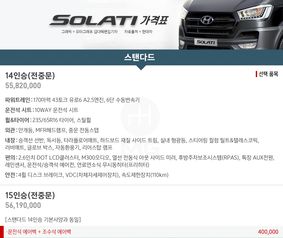 최근 현대차 홈페이지에 대형밴 쏠라티의 정확한 제원과 가격이 공개됐다. 업계 관계자에 따르면, 쏠라티는 내달 초 국내에 공식 출시돼 본격적인 판매에 돌입할 전망이다. 국내 출시 모델은 14·15·16인승 버스 모델로, 스탠다드, 디럭스, 럭셔리 등 세 가지로 구성된 7개 트림으로 구성됐다. 스탠다드 트림과 럭셔리 트림은 14인승과 15인승, 디럭스 트림은 14인승과 15인승을 비롯해 16인승 모델을 선택할 수 있다.