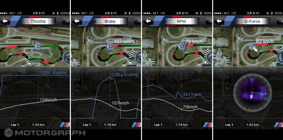 사실 BMW 오너들에게는 이미 꽤 널리 알려진 앱이다. 2013년 BMW가 베타 버전의 M 랩타이머(M Laptimer)를 공개했고, 큰 호평을 받았다. 2014년부터 공개된 정식 버전은 베타 버전과 큰 차이가 없었다. M 랩타이머는 이름 그대로 랩타임을 측정할 수 있다. 이런 기능이 자체적으로 탑재된 스포츠카도 많다. 스마트폰 앱은 그보다 훨씬 더 많은 것을 담고 있다.
