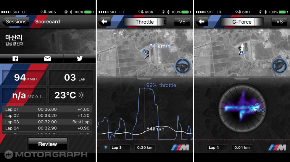 M 랩타이머는 서킷에서만 유용한 것은 아니다. 매일 출퇴근길을 기록하면서 운전습관을 확인할 수도 있다. 엔진회전수를 얼마나 쓰는지, 어떤 구간에서 연료를 많이 소모하는지 알아보는 것도 재미요소다. 또 이런 기록을 메일, 페이스북, 트위터 등으로 공유할 수 있다.