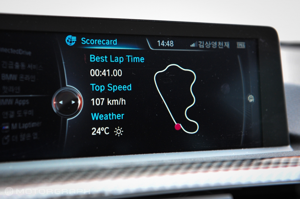 처음엔 ‘지렁이’가 박힌 오른쪽 뒷바퀴가 부담스러워 쉬엄쉬엄 달렸다. 그런데 막상 M 랩타이머로 기록이 측정되니 욕심이 생겼다. 매코너마다 가장 빠른 속도를 체크했다. 이를 조합하면 짧은 코스에서도 3-4초는 더 줄일 수 있을 것 같았다. 점차 지렁이 걱정은 사라지고, 속도를 높이기 시작했다. 최근 교체한 M 퍼포먼스 배기의 날카로운 소리가 오토시티에 울려퍼졌다.