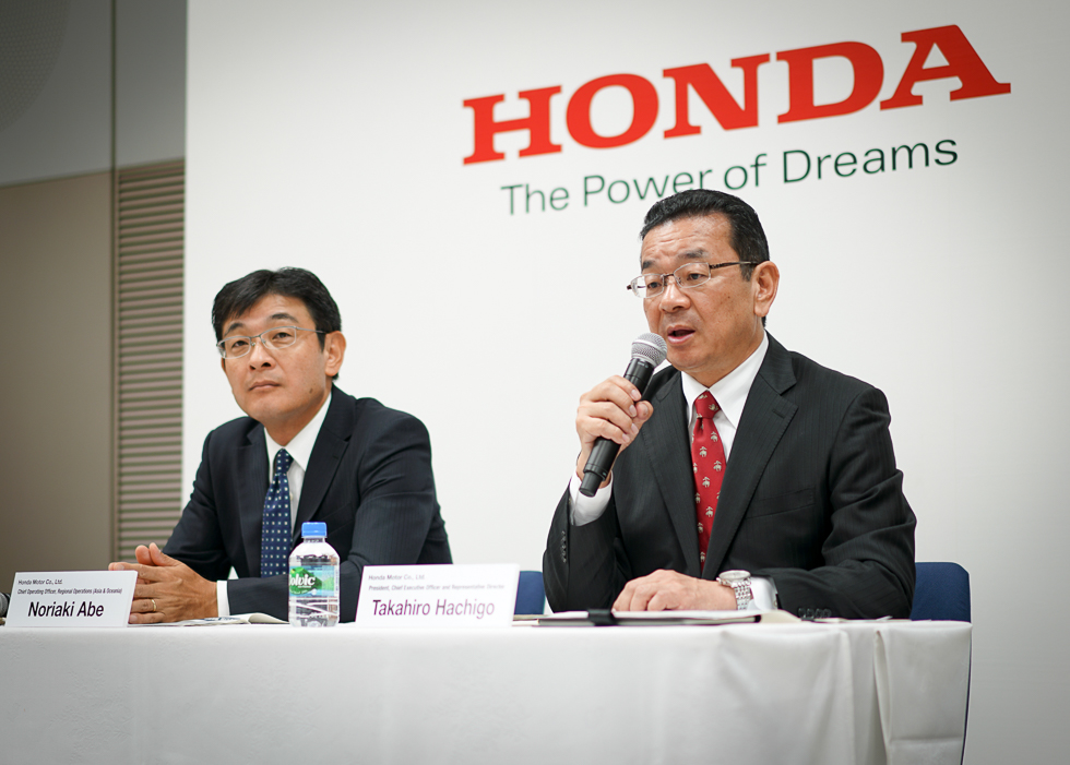 일본 혼다자동차의 타카히로 하치고 사장과 노리아키 아베 본부장은 29일 오전 일본 도쿄에 위치한 혼다 본사에서 세계 의 기자들을 대상으로 기자회견을 개최했다.