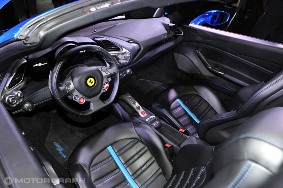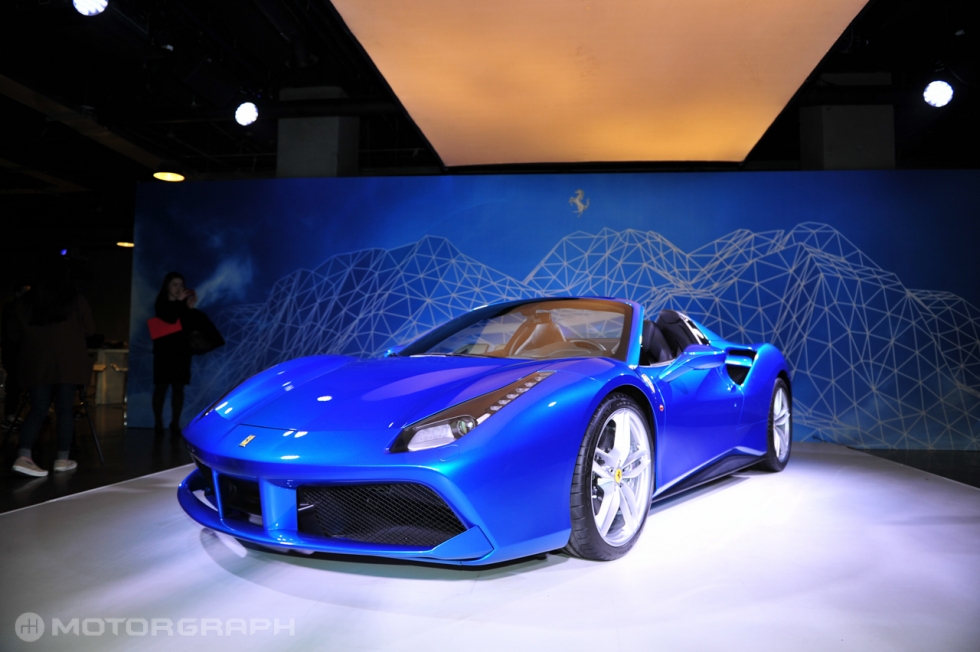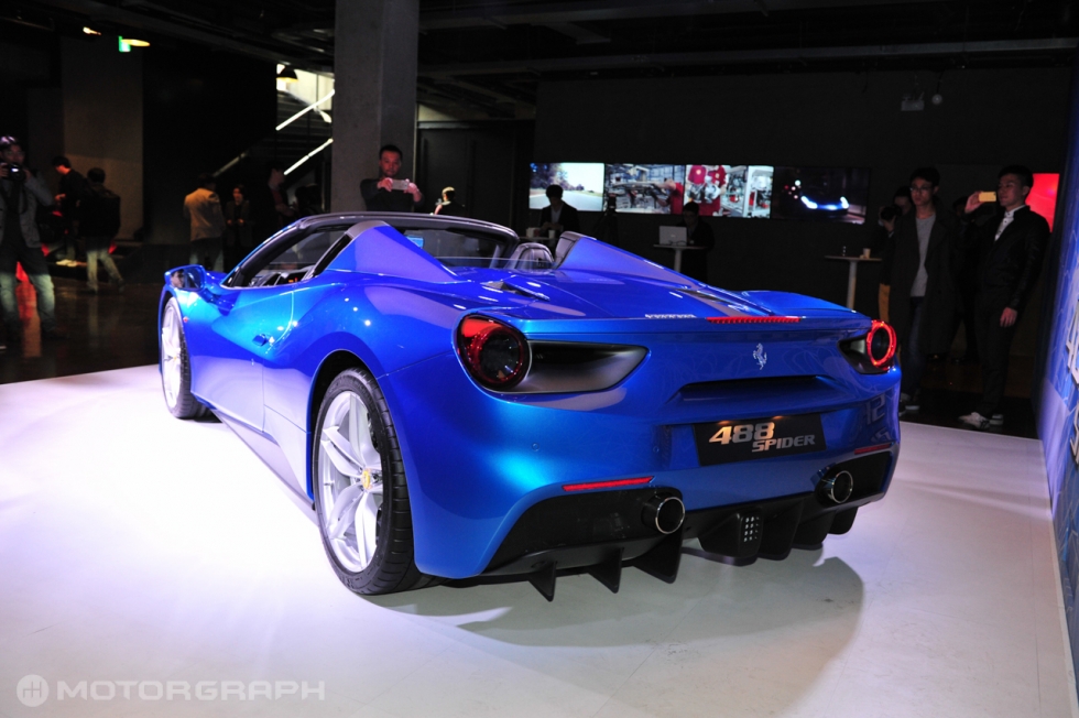 한편 국내에 첫 선을 보인 488 스파이더의 외관은 청명한 하늘빛의 블루 코르사(Blu Corsa)로 488 스파이더의 모습을 더욱 부각시키기 위해 새롭게 탄생된 색이다. 이 색의 메탈릭한 입자들은 차체의 입체감을 강조하고, 이중 도색작업을 통해 다채로운 색상을 표현하는 효과를 낸다.