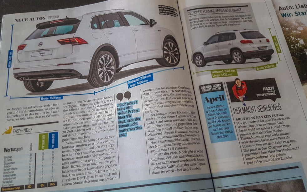 최근 독일의 자동차 전문지 아우토빌트는 폭스바겐 본사에 요청해 신형 티구안에 대한 실용성 테스트를 할 수 있게 지원해달라 요청했다. 실용성 테스트는 차체 설계가 얼마나 잘 되어 있는지를 살펴보는 것으로, 승하차의 편리함을 비롯해 트렁크 공간 및 짐 싣고 내리기, 콕핏의 구성과 사용 편의성, 좌석과 실내 공간 등의 수준을 체크하는 것이다.
